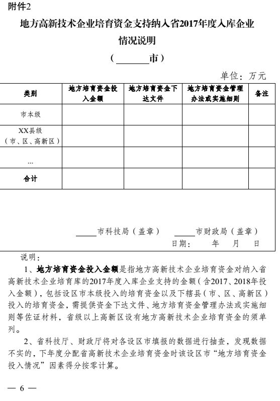 為深入貫徹黨的十九大和省委十三屆三次全會(huì)精神,全面落實(shí)高質(zhì)量發(fā)展要求和“兩聚一高”戰(zhàn)略部署,進(jìn)一步加快高新技術(shù)企業(yè)培育工作,深入實(shí)施高新技術(shù)企業(yè)培育“小升高”計(jì)劃,根據(jù)省財(cái)政廳、科技廳《關(guān)于印發(fā)〈江蘇省高新技術(shù)企業(yè)培育資金管理辦法(試行)〉的通知》(蘇財(cái)規(guī)〔2017〕20號(hào),以下簡稱《管理辦法》)要求,現(xiàn)就江蘇省高新技術(shù)企業(yè)培育庫2018年度入庫企業(yè)申報(bào)工作有關(guān)事項(xiàng)通知如下: