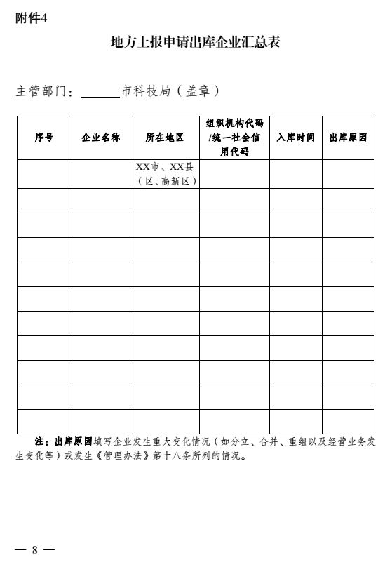 5、各設(shè)區(qū)市科技部門要加強(qiáng)對入庫企業(yè)的跟蹤與監(jiān)督,對發(fā)生重大變化(如分立、合并、重組以及經(jīng)營業(yè)務(wù)發(fā)生變化等)后不符合入庫條件的,或在入庫申請過程中存在嚴(yán)重弄虛作假行為的,以及培育期間發(fā)生重大安全、重大質(zhì)量事故或有嚴(yán)重環(huán)境違法行為的,及時(shí)填報(bào)“地方上報(bào)申請出庫企業(yè)匯總表”(見附件4),并正式行文報(bào)請省科技廳予以出庫,取消其培育資格。